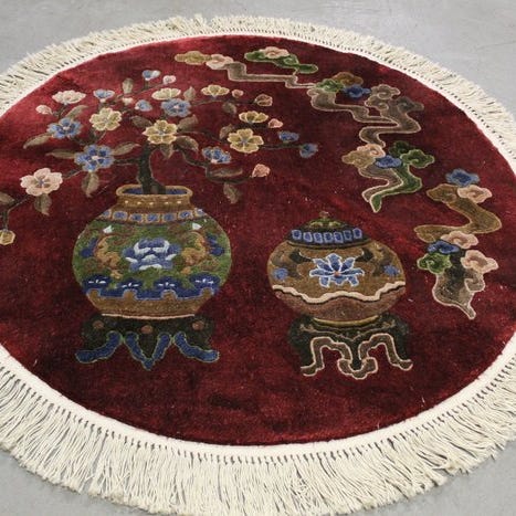 Antikt håndknyttet uldtæppe fra Kina, lavet efter den traditionelle vævning i Leshan-stil. Det har en afbalanceret sammensætning med delikate mønstre inspireret af den klassiske kinesiske æstetik, ofte hentet fra naturen og symbolske motiver. Den fine håndværk og det enkle design afspejler den raffinerede dygtighed, der er karakteristisk for kinesiske tæpper fra midten af det 20. århundrede.