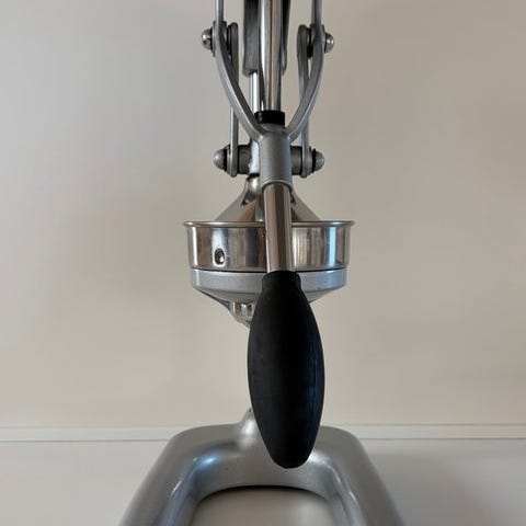Smuk og robust udgave af en vintage professionel, manuel citruspresser. Citruspressen har et Space Age-design og fungerer fremragende. Den er også fuldt funktionel med en vippefunktion. Dette betyder, at der kræves lidt kraft for at opnå maksimal udbytte, en presser der arbejder mere effektivt end en almindelig eller elektrisk citruspresser. Der er ingen elektricitet nødvendig, og presseren er kompakt, hvilket betyder, at den optager lidt plads på køkkenbordet og nemt kan opbevares.