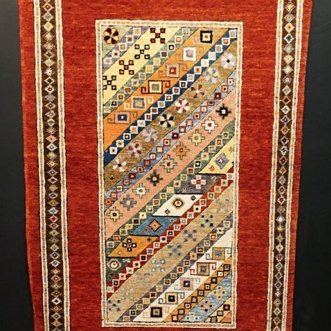 Designet er udført i en harmonisk palet af bløde beige, creme, brune, dæmpede blå og varme jordtoner, smukt afdæmpet af alderen. Fint detaljerede kanter med blomster- og geometriske motiver indrammer det centrale felt og afspejler det