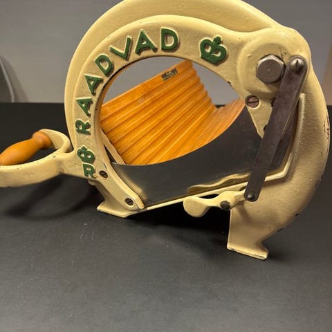Dette er en håndbetjent brødsnitter fra Raadvad, modelnummer 294.