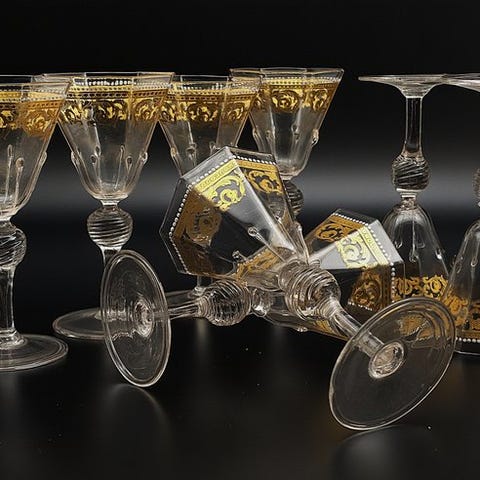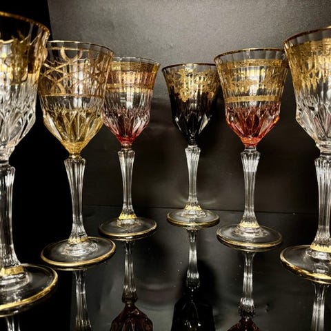 Det sker nogle gange, at jeg observerer visse skønheder, de er glatte og skinnende i hånden, som kun det rene krystal fra Böhmen kan være, alt sammen beriget med dekorationer i rent guld, der når perfektion i teknik og håndværk hos vores glasmestre fra Murano. Først gravet med pantografen og derefter håndmalet, vil disse glas fange opmærksomheden hos enhver, der ser på dem.