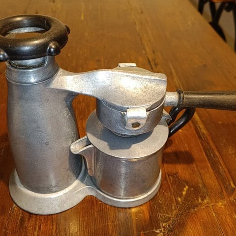 Victoria Arduino Venus espressomaskine, stor model, Venus family, fra 90'erne. Højde 50 cm. Beskrivelse af maskinen. Inkluderer 1 kaffefilterholder. Testresultater: Maskinen tændes. Modstanden varmer op. Vandpumpen fungerer. Den starter op. Laver støj, da den er tom for vand. Jeg har ikke prøvet at lave kaffe. En revision anbefales for kalkrensning. Som vist på billedet viser nogle messingdele tegn på tidens gang. Da det er en ret krævende maskine, både at sende og pakke, anbefales det at tænke sig godt om, før køb. Tak, Victoria Arduino Venus.