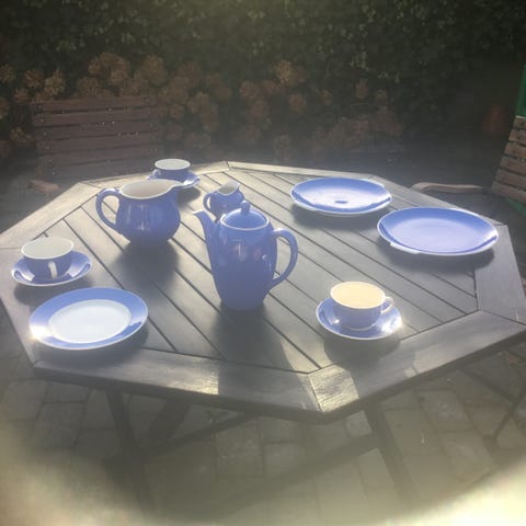 De stilsikre blå knapper på kaffekanden og sukkerdåsen understreger den klassiske, traditionelle karakter af dette service.