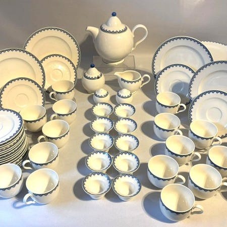 Til salg står et meget elegant og kvalitetsfuldt kaffestel fra Villeroy & Boch Casa Look af fint porcelæn i tidløst hvidt med en elegant blå ornamentkant.