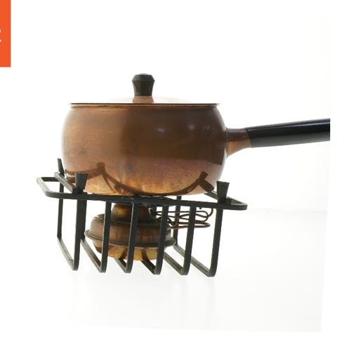Smuk kobberblus med håndtag og grydeholder i messing. Funktionelt med alkohol.