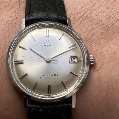 Vintage Omega automatic Seamaster i rustfrit stål med dato fra 1961. Uret har et Omega automatic in-house værk cal. 562 med serie nr. 18.321.XXX, der daterer uret til 1961. Ref. nr. er 14701 og urets diameter er 33,5mm, målt uden krone. På bagkassen er der klassiske og legendariske Seamaster søhest. Skiven er hvid farvet med sølv farvede "Dauphine" visere, hævede indexer og Arabertal 6,9 & 12. Der er monteret nyt originalt Omega glas og original Omega krone. Uret er serviceret i december 2025 og det går og holder tiden fint samt dato funktion virker upåklageligt. Der er monteret ny sort læderrem. Mulighed for anden farve rem. Der ydes 14 dages returret. Husk, at se andre spændende ure, som jeg har til salg herinde:-) !!!KUN SERIØSE HENVENDELSER!!!