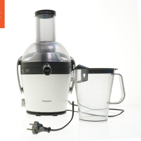 Philips juicer med tilhørende beholder til opsamling af juice. Velegnet til fremstilling af frisk juice fra frugt og grøntsager.