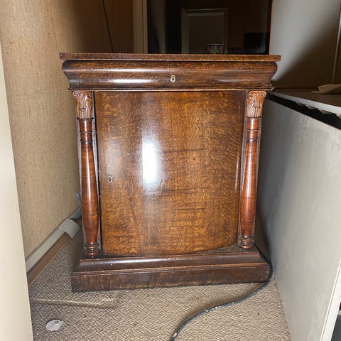 Gråt malet træ konsol med en skuffe og en hylde under bordpladen. Bordet har fire ben med dekorative detaljer og en firkantet bordplade. Velegnet til opbevaring af mindre genstande ved siden af sengen.