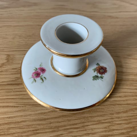 Kjøbenhavns porcelæn maleri Rosenborg stellet, høje lysestage, diameter 9 cm. højde 8 cm. Hel og fin stand, pæn i guldkanten. Passer til almindelige kronelys.