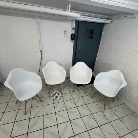 10 hvide skalstole.