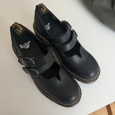 Dr. Martens højhælet sko i størrelse 38. Skoene er lavet i sort materiale og har snørelukning foran. Designet er klassisk med spids tå og hæl.