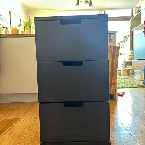 Perfekt til tøj/legetøj. Vi har lagt en hvid plade under kommoden for at tilpasse højden til vores behov, men det fjerner vi inden afhentning.