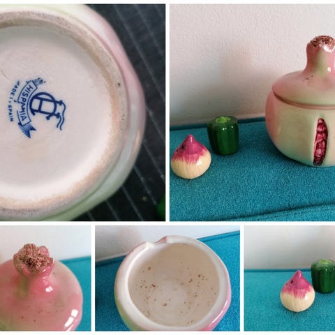 Fint ældre lille Sukker/Marmelade Hus Cottage House i porcelæn formentlig fra Westminster Pottery nummeret i bunden Mål Højde M/fugl 13 cm samt 2 ældre knive fra Sheffield/Scottia med farvet skaft L. 17 cm