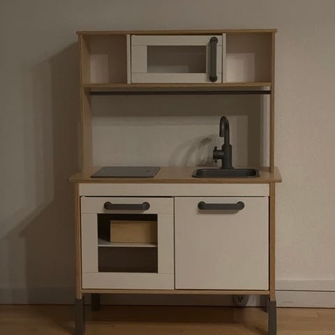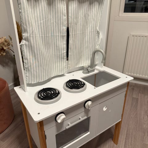 børnekøkken i træ med hvid finish. Køkkenet indeholder komfur med tre kogeplader, ovn med gennemsigtig låge, vask med metalvask, mikrobølgeovn med dør, og hylder til opbevaring. Designet til børn og fremstillet i træmateriale.