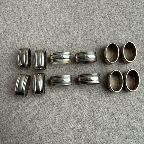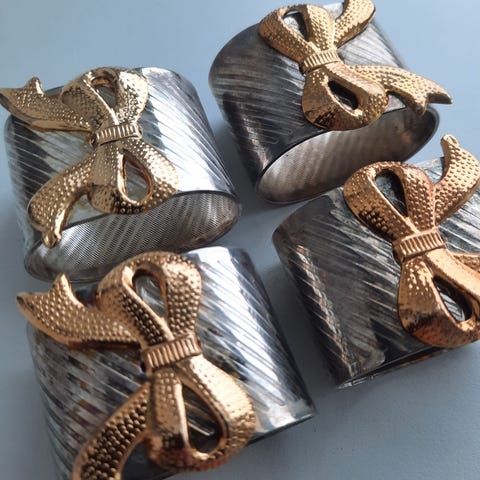 20 gamle sølvfarvede servietringe med sløjfer på. De er alle stort set ens, men der kan være en minimal forskel på størrelsen af sløjferne på nogle af dem.. Men de er SÅ fine sammen.. og sjældent set med 20 stk!