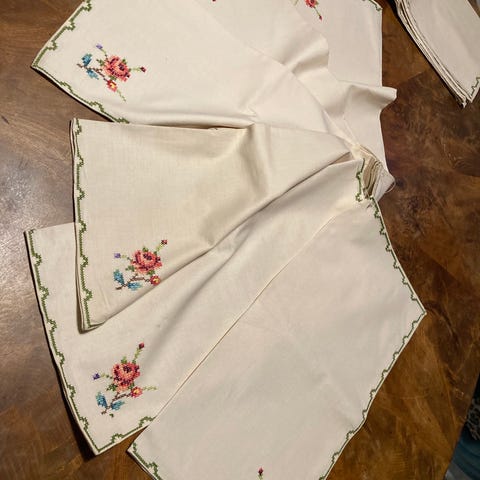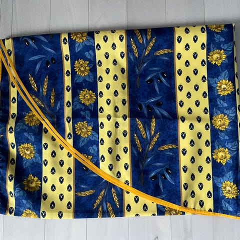 &Tradition tekstil med blå og lilla farver og dekorative mønstre. Midten af dugen er svagt lysegrøn, det er svært ar se på billeder.