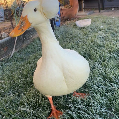 Han er vant til at gå frit sammen med andre ænder, hund, kat og børn.