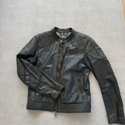 Flot og velholdt Belstaff H racer jakke, størrelse 46 (small) i kraftig gummi-agtig materiale med let foring. Fremstår som ny.