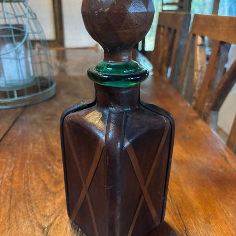 Dram flaske med læder overtræk, Det er en glasflaske, som er betrukket med læder.