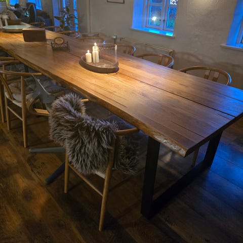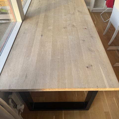 Eg bord med bordplade i massivt limet egetræ og sort metalstel. Bordet måler 200 cm i længden og 100 cm i bredden. Designet til anvendelse som spisebord.