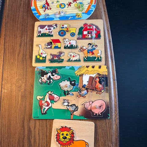 Vintage træpuslespil med dyremotiver, herunder en hane med trompet og forskellige dyr med musikinstrumenter. Farverig og dekorativ, velegnet til børn. Lavet af træ. ( 1987)