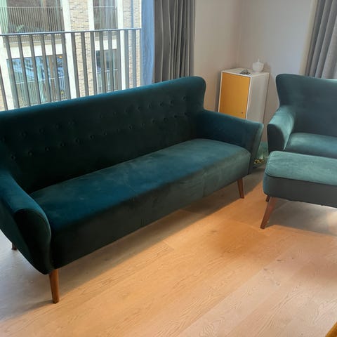 RESERVERET Super flot og behagelig sofa i uld og med stel i mørkt træ. Er så vidt jeg ved udgået.