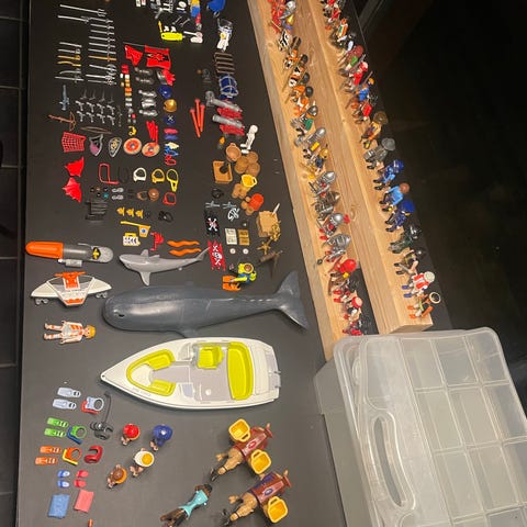 Playmobil legetøjsfigurer og tilbehør sæt med mange forskellige figurer, dyr og rekvisitter. Indeholder mennesker i forskellige uniformer og kostumer, dyr som heste, hund, fugle og aber, samt diverse små genstande som kister, møbler og redskaber. Mange sværd. Primær blanding af ridder, pirat og politi.