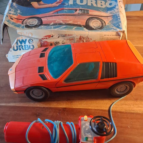 Computacar radiostyret bil legetøj med fjernbetjening. Inkluderer bil, fjernbetjening, manual og ekstra dele. Produktet er beregnet til børn og har en retro design.