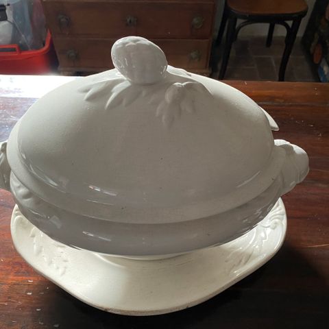 Fransk Saint Amand et Hamage Persan terrin med låg og håndtag. Fremstillet i fajance med petrol grønne dekorative mønstre, formodentlig fra starten af 1900 tallet. Perfekt uden skår eller revner.