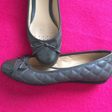 Geox Ballerinasko i størrelse 38. Skoene er sort læder med en polstret indersål for komfort. Designet som klassiske ballerinaer med en lille sløjfedetalje foran. Lak snude og hæl uden ridser.