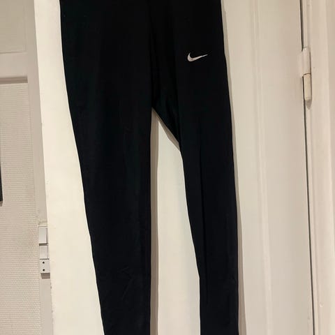 Nike Løbetights Dri-FIT i størrelse M til kvinder. Tightsene har et mønster og er lavet af Dri-FIT materiale, som hjælper med at holde huden tør under løb.