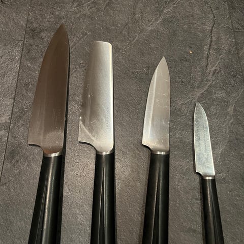 Knivblok med plads til 8 knive og et strygestål kr. 100,-, en Rosendahl køkkenkniv knivblad måler 16 cm kr. 60,-, en Dick Premier Plus Santoku kokkekniv - 18 cm nypris kr. 1.289,- sælges for kr. 300,-, Twilling Four Star brødkniv - 20 cm nypris kr. 579,95 - sælges for kr. 150. Urtekniven fra IKEA følger med i et samlet køb. Samlet pris for det hele