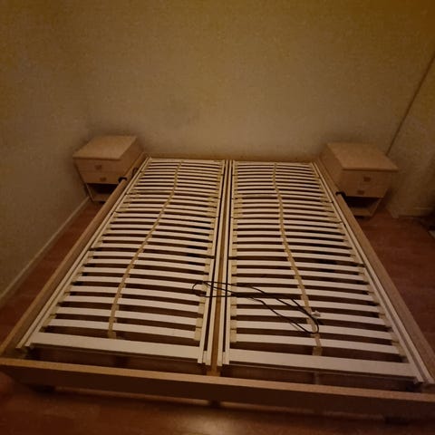 Elevationsseng med sengeborde og madrasser samt rygpuder.