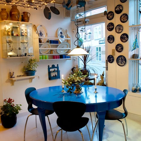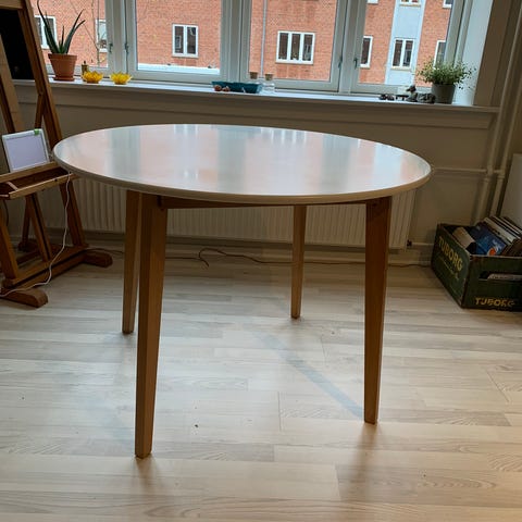 Er fint rundt hvidt spisebord med plads til 4 stole