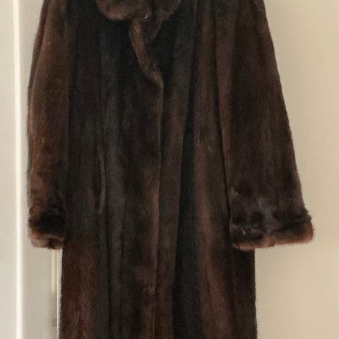 Kort beskrivelse: Utrolig velholdt og elegant mørkebrun minkpels med et pænt ærmeopslag og matchende mørkebrunt for - sælges.