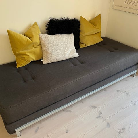 Ilva sovesofaer i sort stof. Kan foldes ud til dobbelt mål og har en enkel, moderne design. Passer til ungdomsværelse/gæsteværelse.