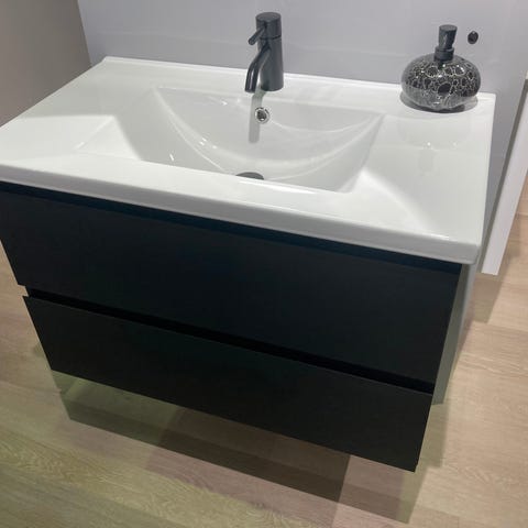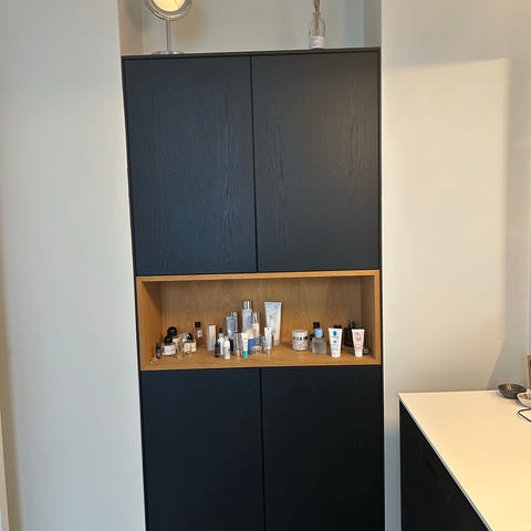 Meget flot badeværelses møbel i mat sortbejdset eg m. Eg natur reol i midten. Hylder til masser af opbevaring. Special designet af Byg og Design Silkeborg
