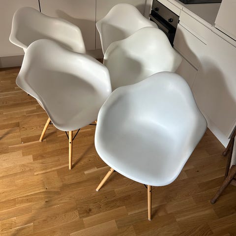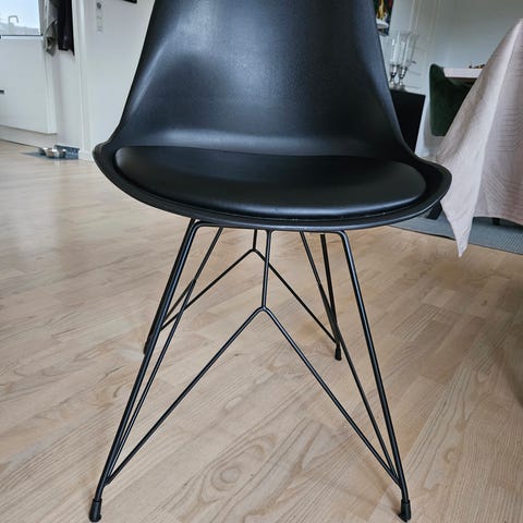 8 rigtig fine sorte skalstole, i hård plast. Med polstret siddepude. Rigtig gode og komfortable, passer perfekt til spisebordet. Stolene har enkelte mærker i kanten af ryglænet, hvor de har ramt vores spisebord. (Er ikke forsøgt udbedret)