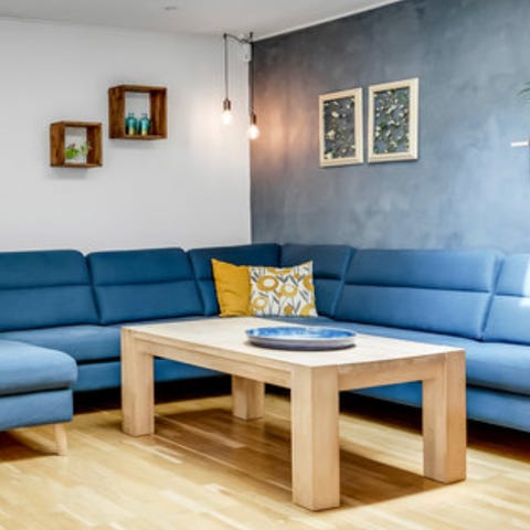 En rigtig god sofa der søger nyt hjem, da vi ønsker en lidt mindre sofa. Farven er blå grå, det er en smule svært at få frem på billederne.