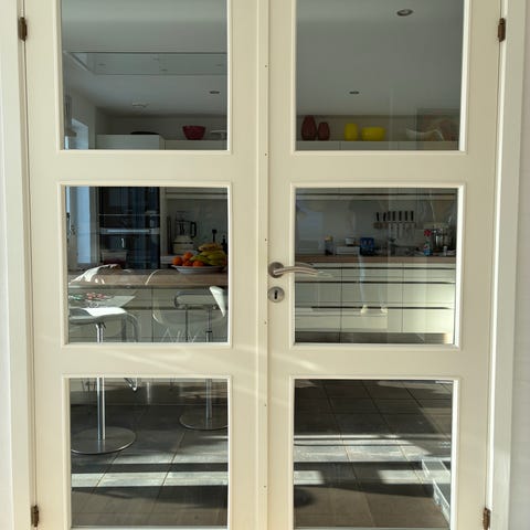 Swedoor Jeld-Wen dobbeltdør i træ med glasfelter. Døren består af to døre med rammer i træ og glasindlæg, der tillader lysgennemgang. Velegnet til indvendig brug, hvor der ønskes både funktion og mulighed for lys.