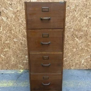 Skabet er udført i massivt træ – sandsynligvis eg – med lysere træ indvendigt i skufferne. Originale messinggreb med etiketrammer på alle skuffer og en flot, autentisk patina.