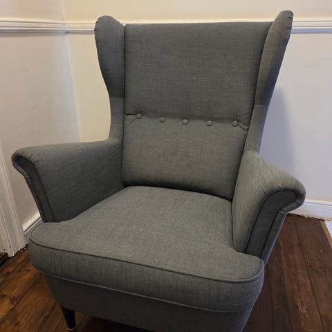 Lænestol med slid på forkant og armlæn som det ses på billederne.