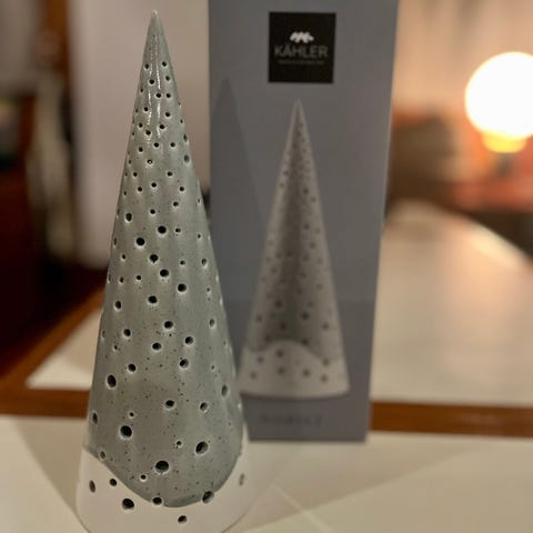 Smuk Kähler Nobili keramik lysestage med perforeret design, der skaber et varmt og stemningsfuldt lys, når den er tændt.