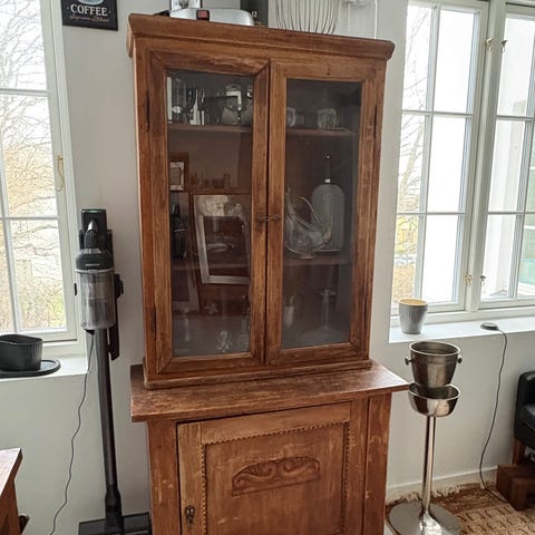 Smuk Fransk vintage vitrineskab importeret fra frankrig. skabet kan deles i to ved transport. fremstår i flot stand med aldersrelateret brugspor.