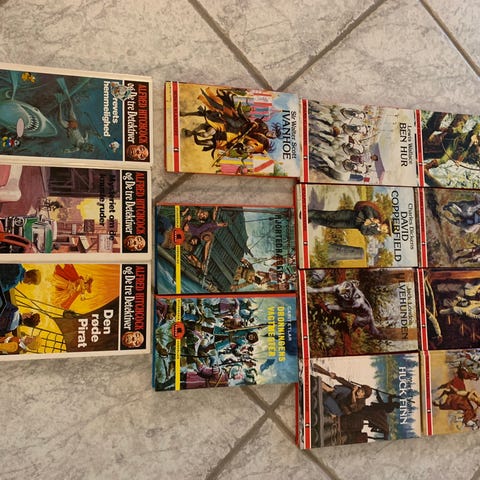 Alle bøger som vist på billedet sælges samlet. De fleste af dem er gode gamle Union bøger, hvor beskrivelsen fra omslaget er klistret ind på indersiden af bogen.
