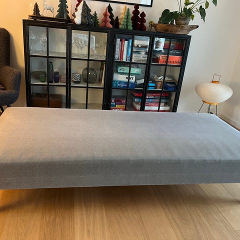 Seng med gråt stofbetræk og træramme. Sengen har en enkel og funktionel konstruktion med en træramme til støtte. Farven på stofbetrækket er grå.