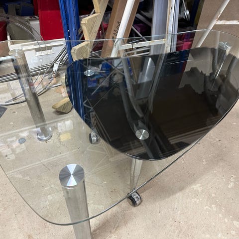Indskudsbord med stålben, klar glasplade og sort glasplade. Kan f.eks. bruges som hjørnebord, sofabord, lampebord mv. Bordet er i fin stand. Måler hhv.: L 100 B 76 H 48 (klart glas) - L 75