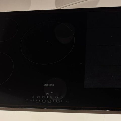 Siemens induktionskogeplade med glaskeramisk overflade. Kogepladen har flere varmesektioner til effektiv madlavning og er designet til nem rengøring og præcis temperaturkontrol.
