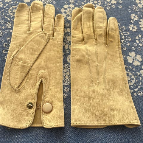 Smukke og lækre skindhandsker fra Day Birger et Mikkelsen i en pæn beige farve med guldnitter. De har for og er dejlig varme. De har lidt patina, som det ses på billederne, men synes stadig de er pæne. Str. small