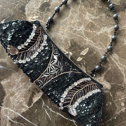 Fin lille farvestrålende selskabstaske med perlebroderier i mange farver og mønstre. Lille rem med større perler. Mål ca. 17 X 12 CM (Excl. rem) .